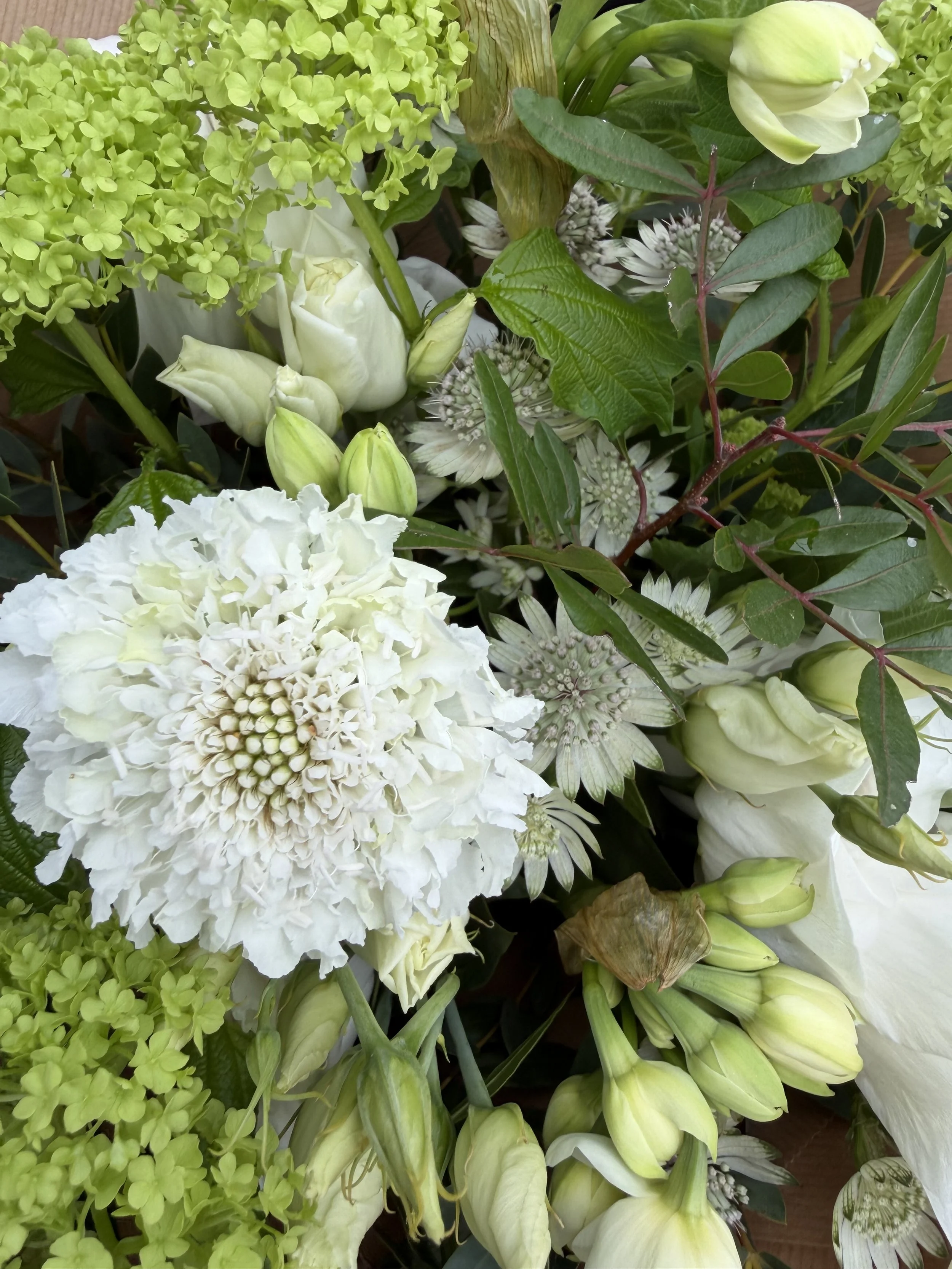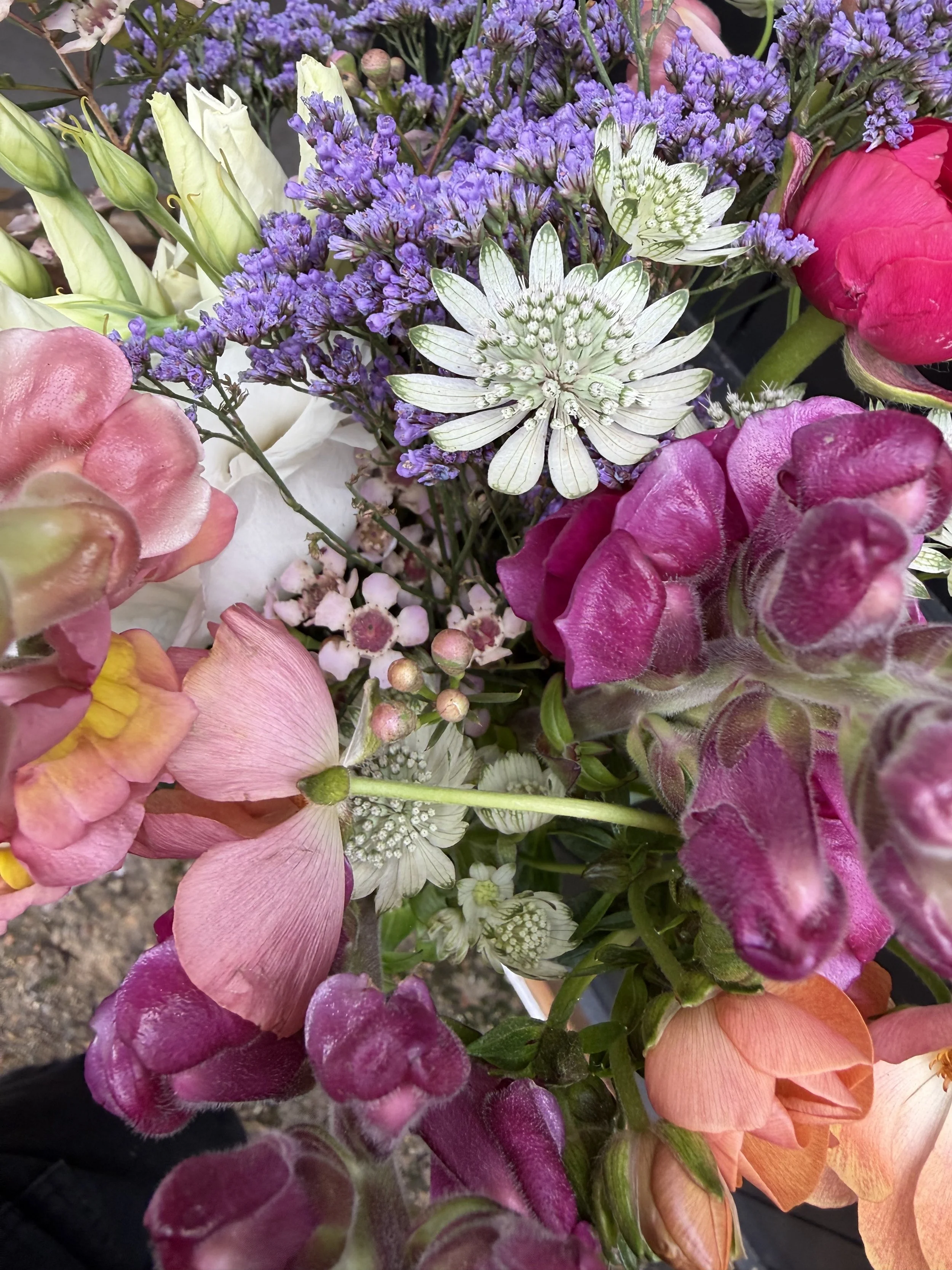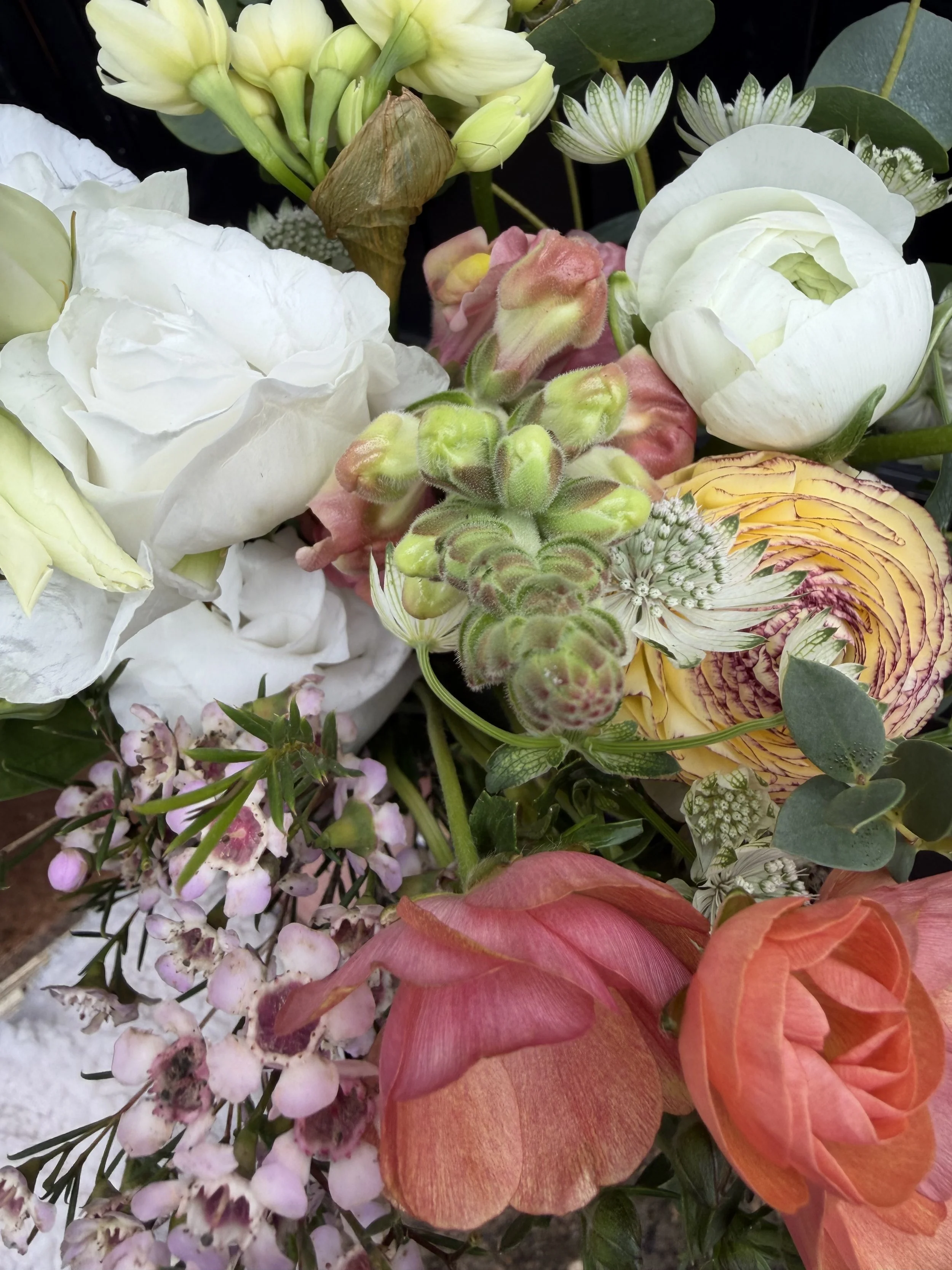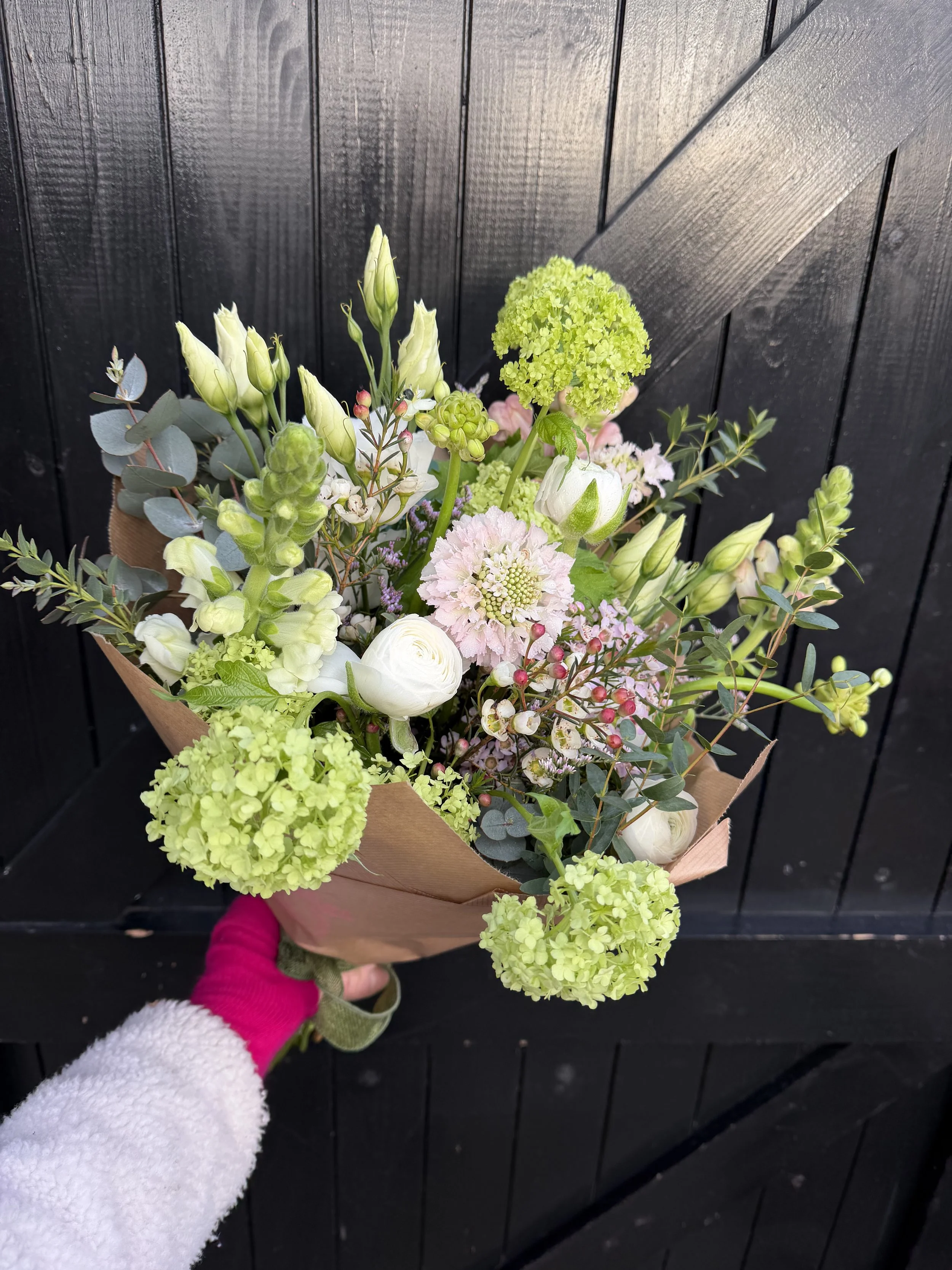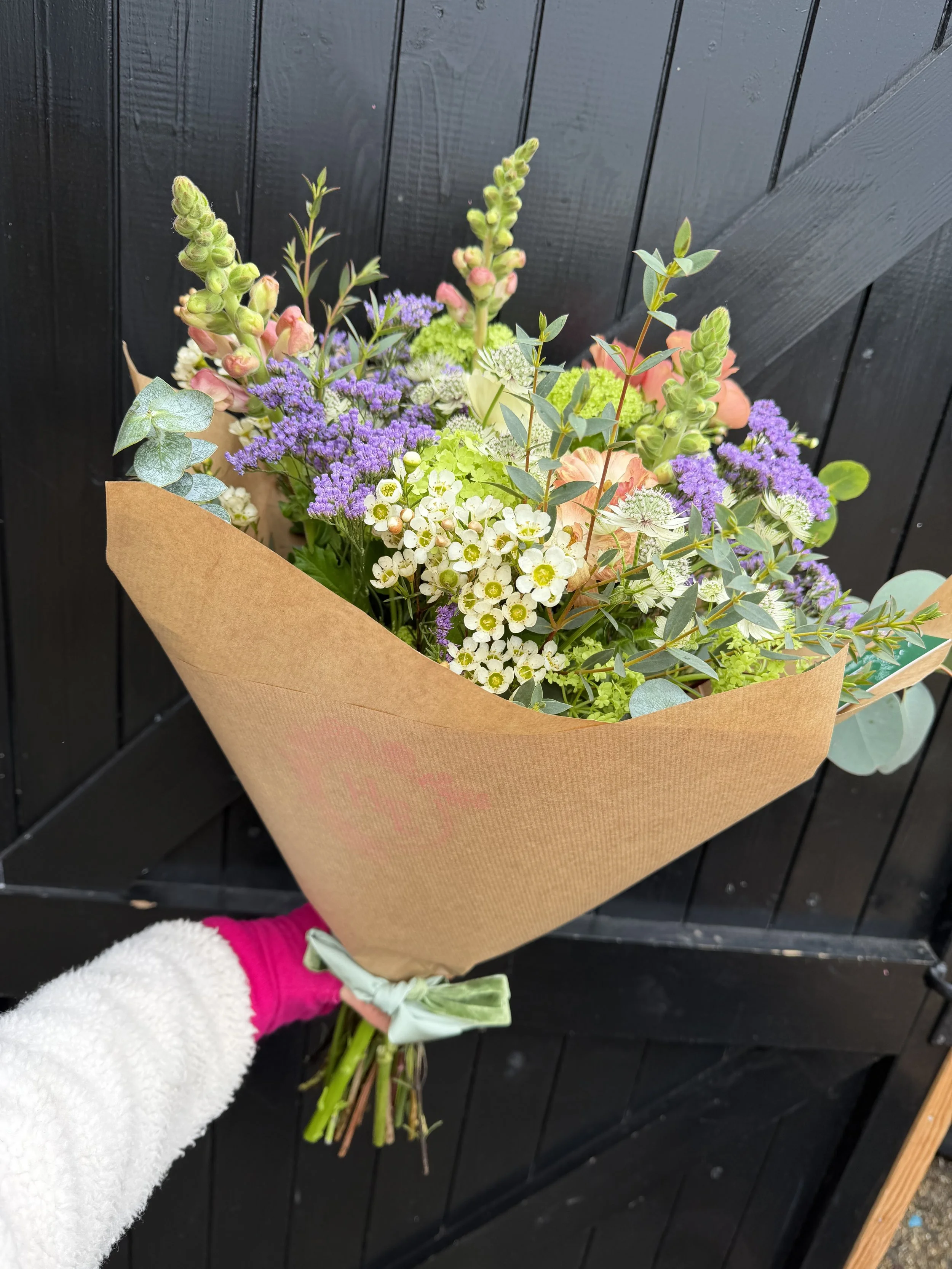 All will be in my signature flower filled style with seasonal blooms and the best quality flowers I can find. Hand tied, wrapped in brown paper and finished with a ribbon. What better.